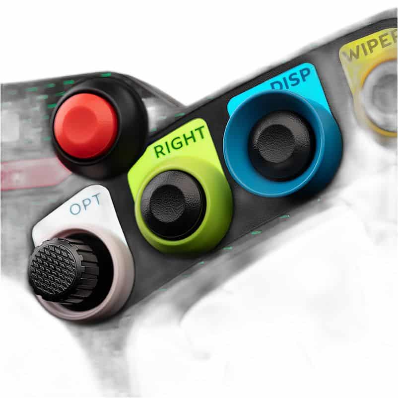Het stuur is afgewerkt met een CNC-gefreesde aluminium rand en een gesmeed carbon frame. De knurling (geribbeld oppervlak) rondom de aluminium knopjes verwijst naar de typische Bentley stijl. De rijke selectie aan inputs omvat acht snap-dome knoppen, twee 7-weg FunkySwitch™ joystickjes, twee aluminium duimwieltjes met optische encoders, en een magnetische schakelhendel met een dual-analoge koppelpedaal-systeem. Dit zorgt dat je nauwkeurig en soepel kunt sturen, schakelen en bedienen.